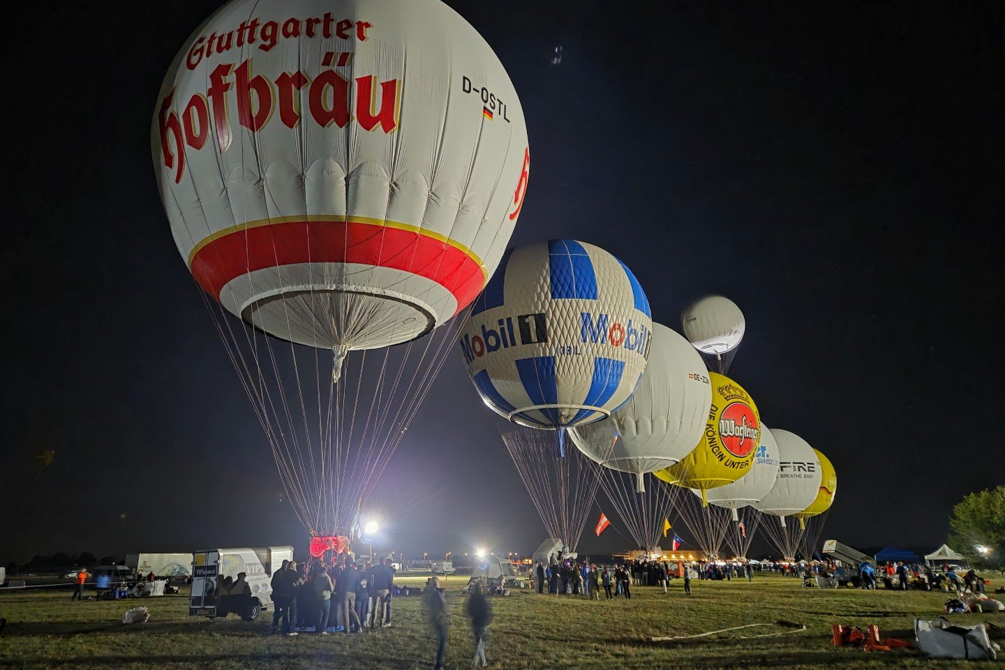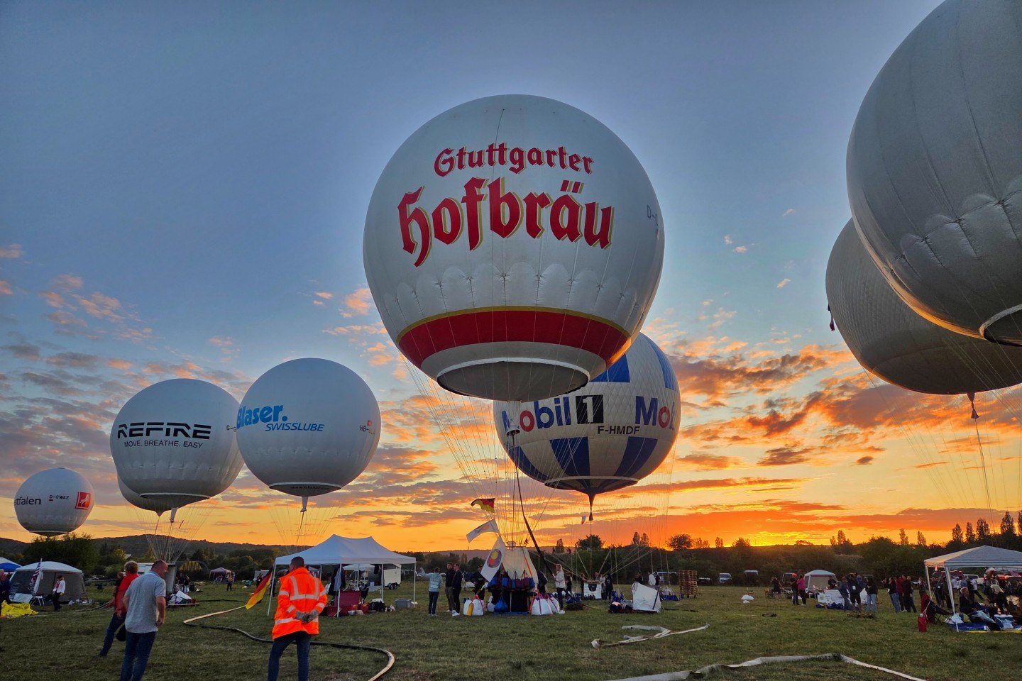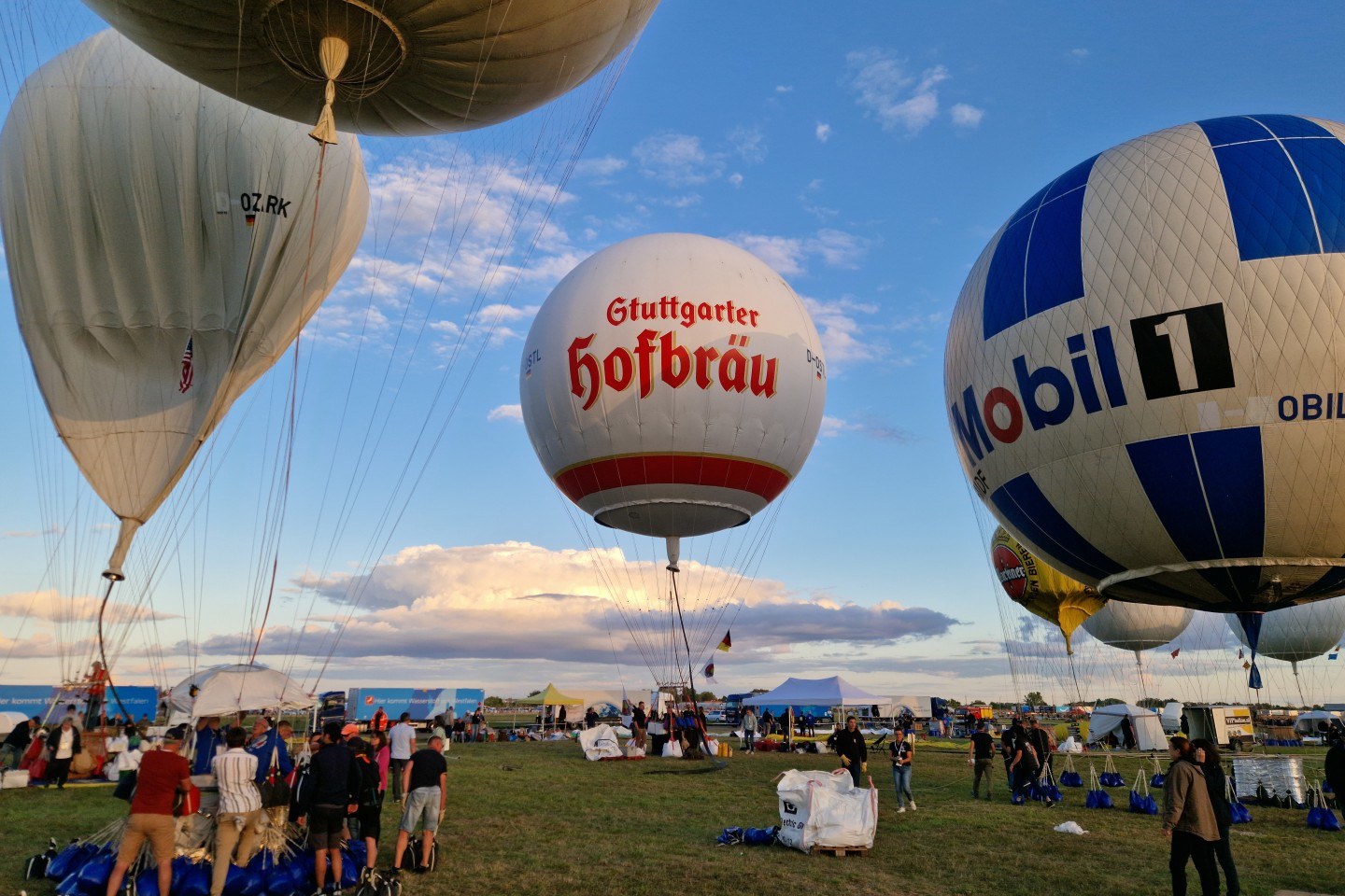 Weather was looking good for the Gordon Bennett weekend, and so, it was clear that the scheduled launch date, Friday evening, September 5th, would work out. The receding cold front brought us some wind and a few showers in the surroundings during the day, but this subsided over the afternoon and only slightly delayed the balloon rigging and launch. Thanks to a perfect preparation, filling the balloon went very smoothly for us, and our D-OSTL “Stuttgarter Hofbräu” was ready to go long before the scheduled launch. Time enough for us pilots to take a leisurely stroll around the launch field and wish the other competitors a pleasant and safe flight, while some of them were still making final preparations in their baskets.
