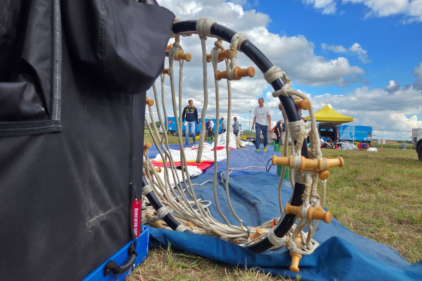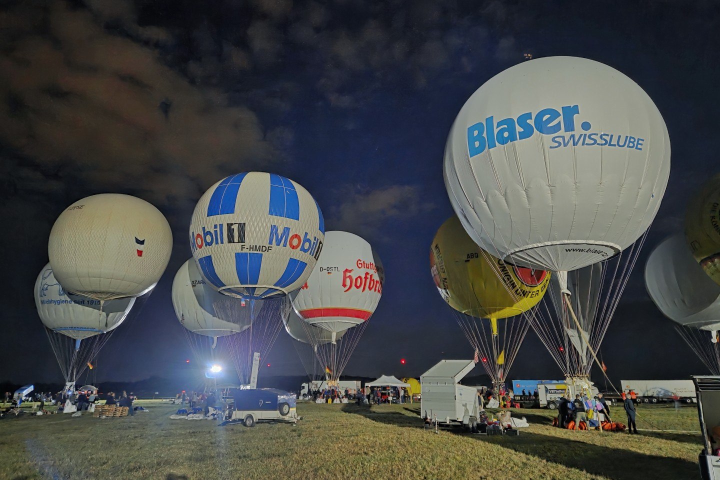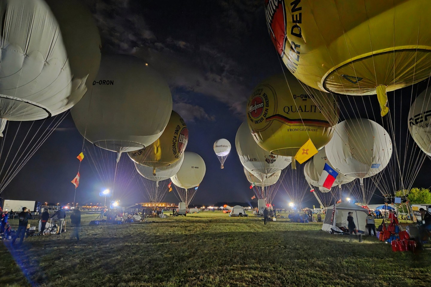 Weather was looking good for the Gordon Bennett weekend, and so, it was clear that the scheduled launch date, Friday evening, September 5th, would work out. The receding cold front brought us some wind and a few showers in the surroundings during the day, but this subsided over the afternoon and only slightly delayed the balloon rigging and launch. Thanks to a perfect preparation, filling the balloon went very smoothly for us, and our D-OSTL “Stuttgarter Hofbräu” was ready to go long before the scheduled launch. Time enough for us pilots to take a leisurely stroll around the launch field and wish the other competitors a pleasant and safe flight, while some of them were still making final preparations in their baskets.