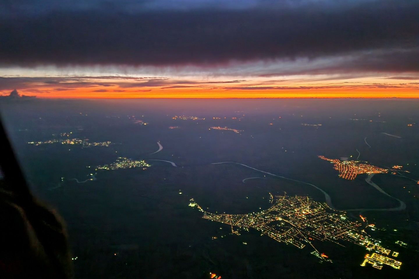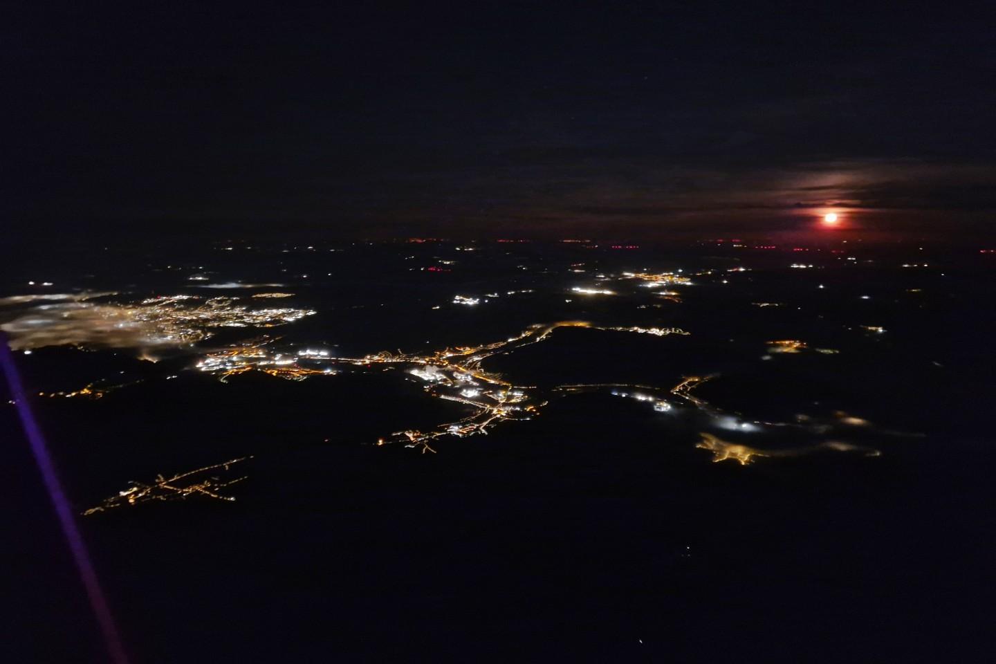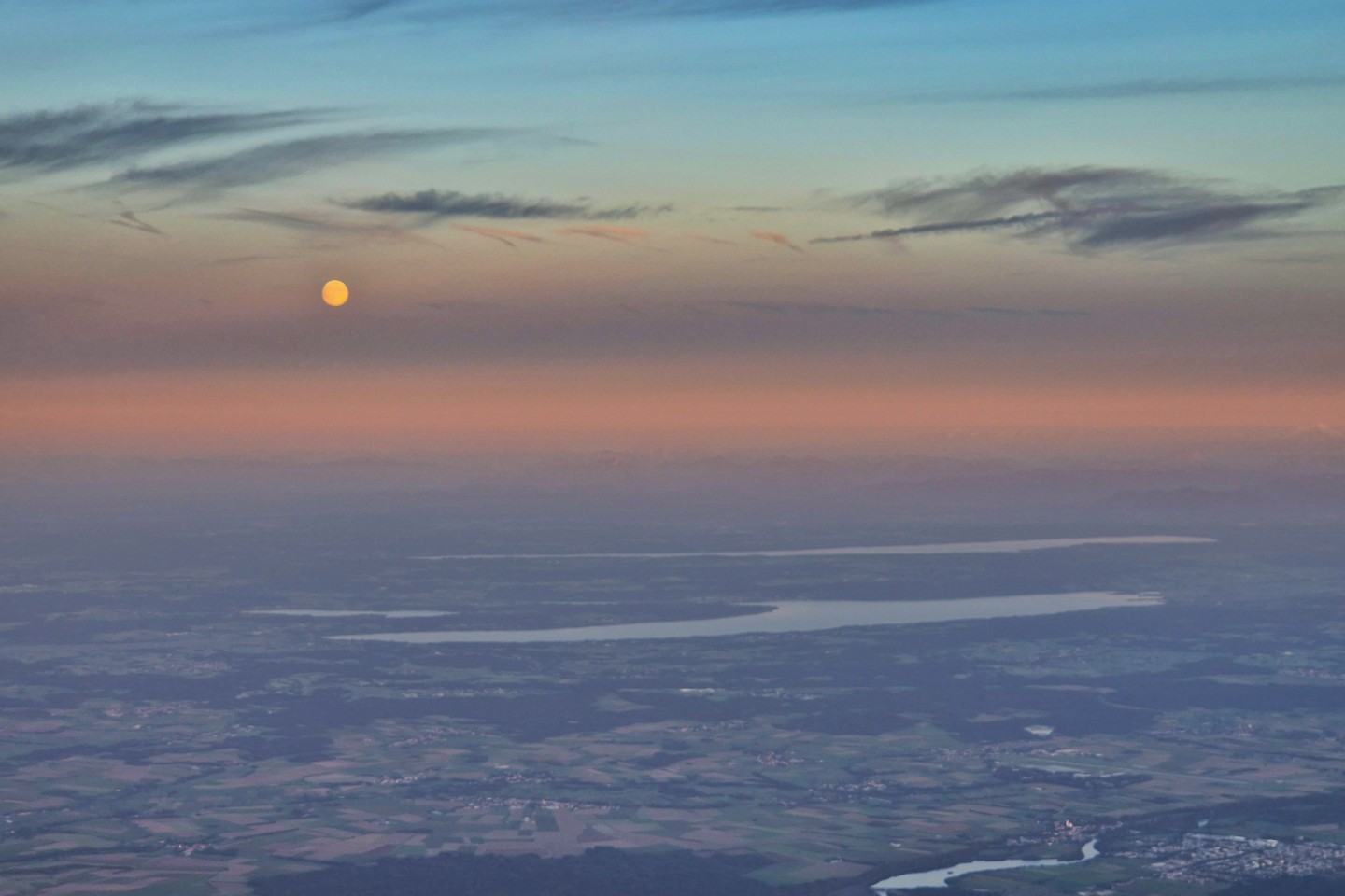 South of Augsburg, the moon finally rises and the sun sets – we can’t quite enjoy the scenery yet, because our entry into Munich airspace is still not guaranteed. A little later, however, the relieving radio message follows: crossing approved between FL120 and FL140. The excellent preparatory work of our Command Center has once again opened a door. South of Lake Chiemsee, we reach the first peaks of the Bavarian Alps.