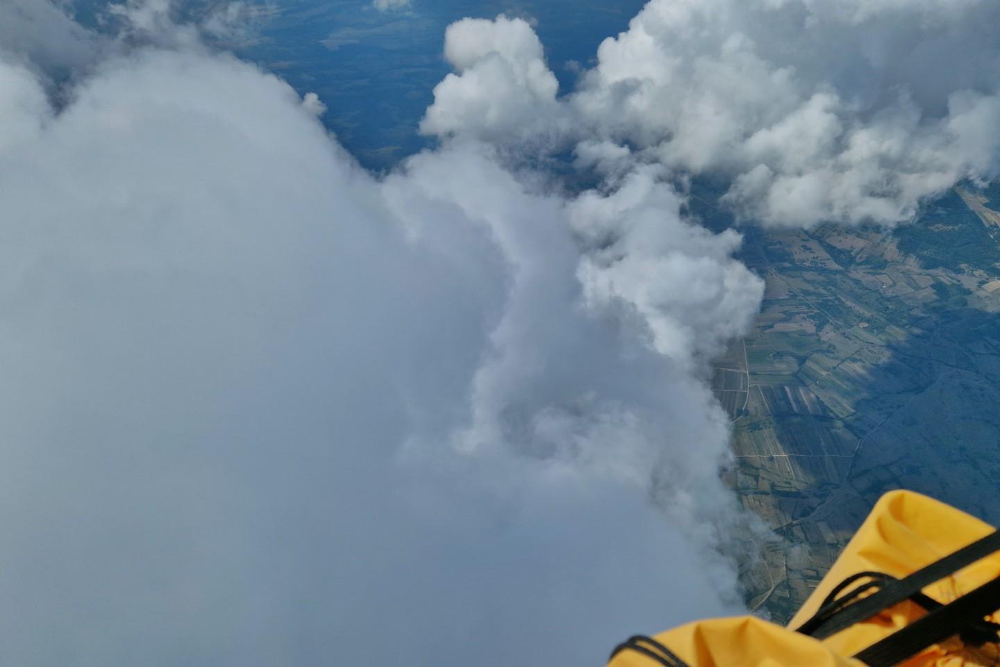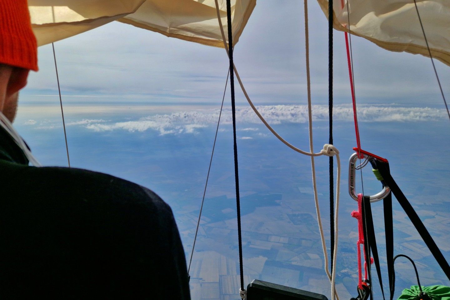 But the clouds have also started to grow around us. We manage to dodge one by climbing up, but the wind direction up there isn’t really helping us. With a small pull on the parachute, we drop back down below the cloud base. The wind direction there is much better. One more kilometer to go! But the thermals are playing with our balloon, pulling us back up to just below the base. Soon, we’re descending just as quickly, having to shed precious ballast. We can’t play this game forever.
