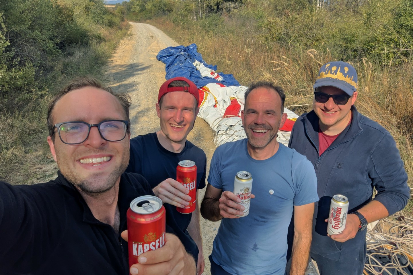 What often goes unnoticed by spectators: A flight like this is never just the achievement of two pilots in a balloon. Our heartfelt thanks go to the members of the Stuttgart Balloon Club, especially our retrieve, the aviation associations of Baden-Württemberg and Germany (BWLV, DaeC) and our entire Command Center, who supported us throughout the flight with precise weather analysis, navigation data, and also mental support. We felt most safe at all times before, during, and after the flight, knowing we have a strong and able team behind us.