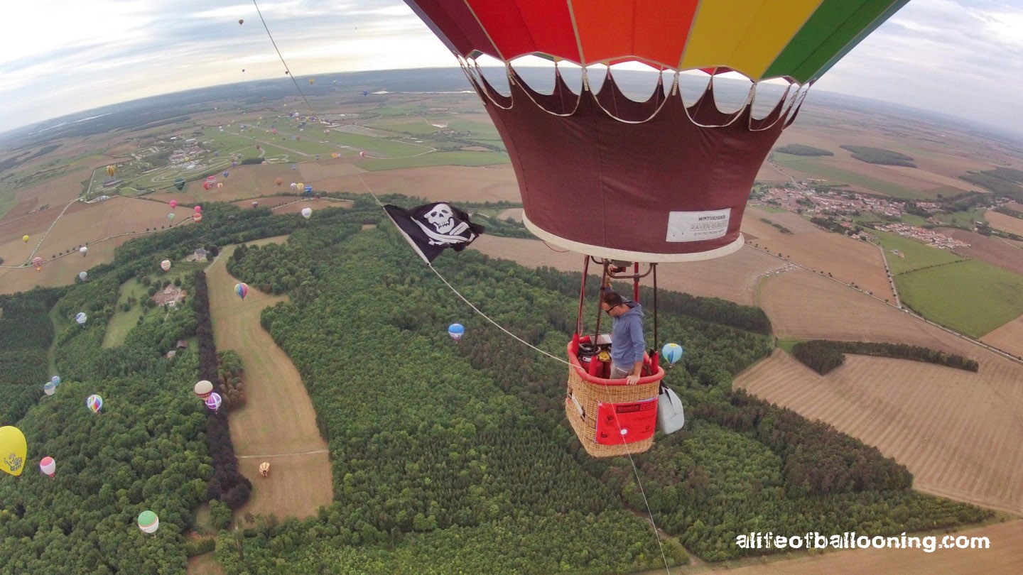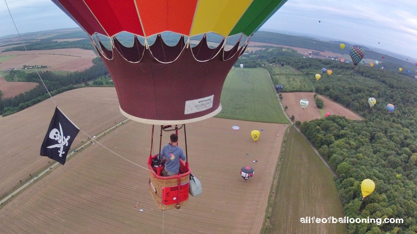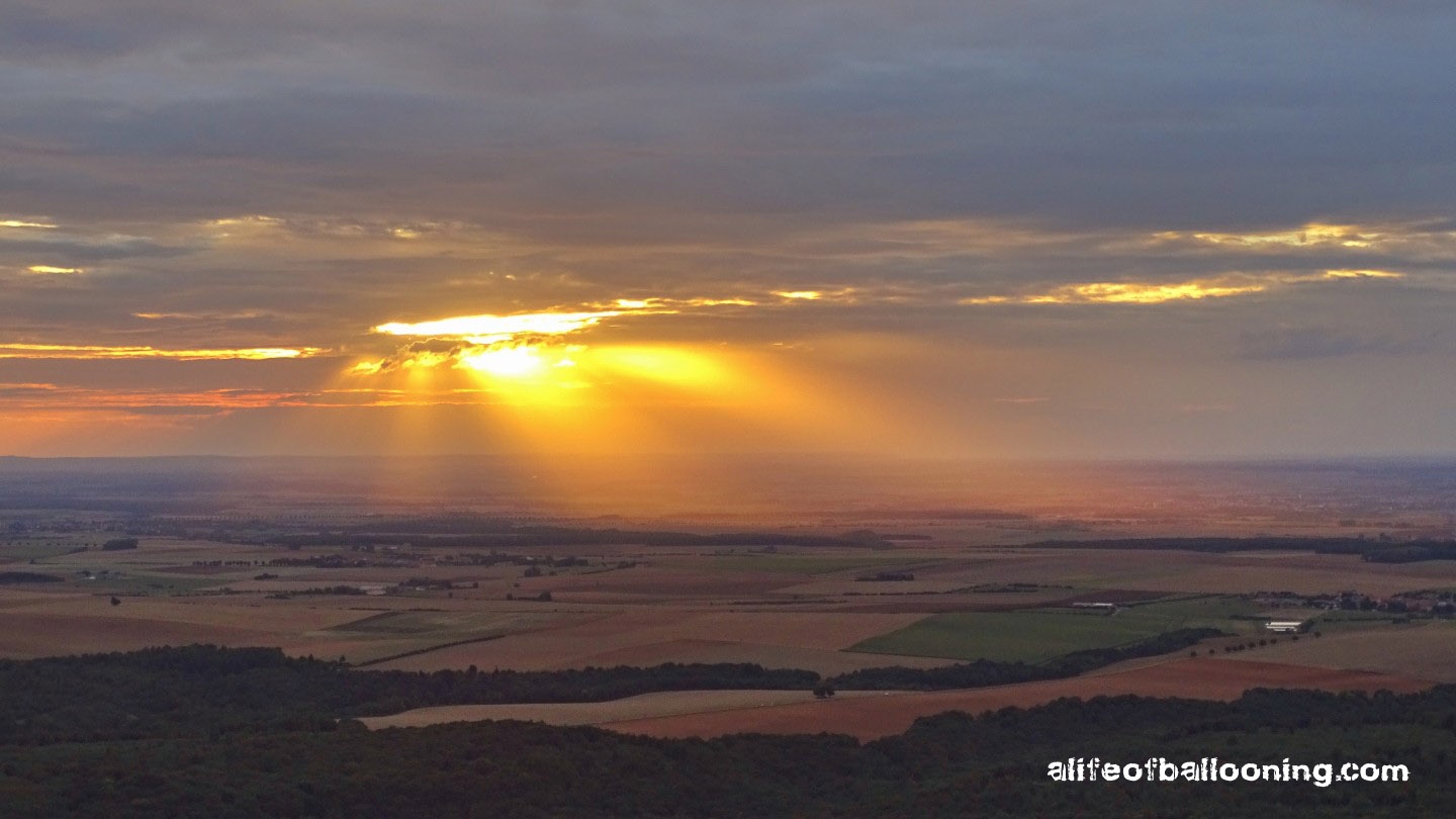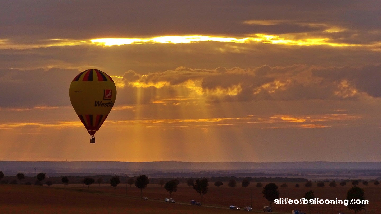 Friday evening finally promised at least a streak of sunlight for the flight – and there it was, beautifully colouring the western skies over Chambley Planet’Air. The balloons flew in an northeasterly direction towards the city of Metz, most of them landing near Gorze, but some of them – like us – also in the Moselle valley. Perfect evening! :-)