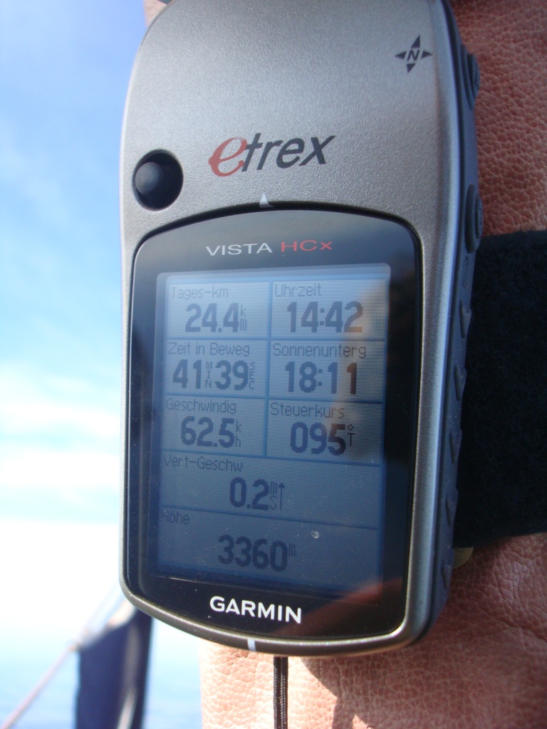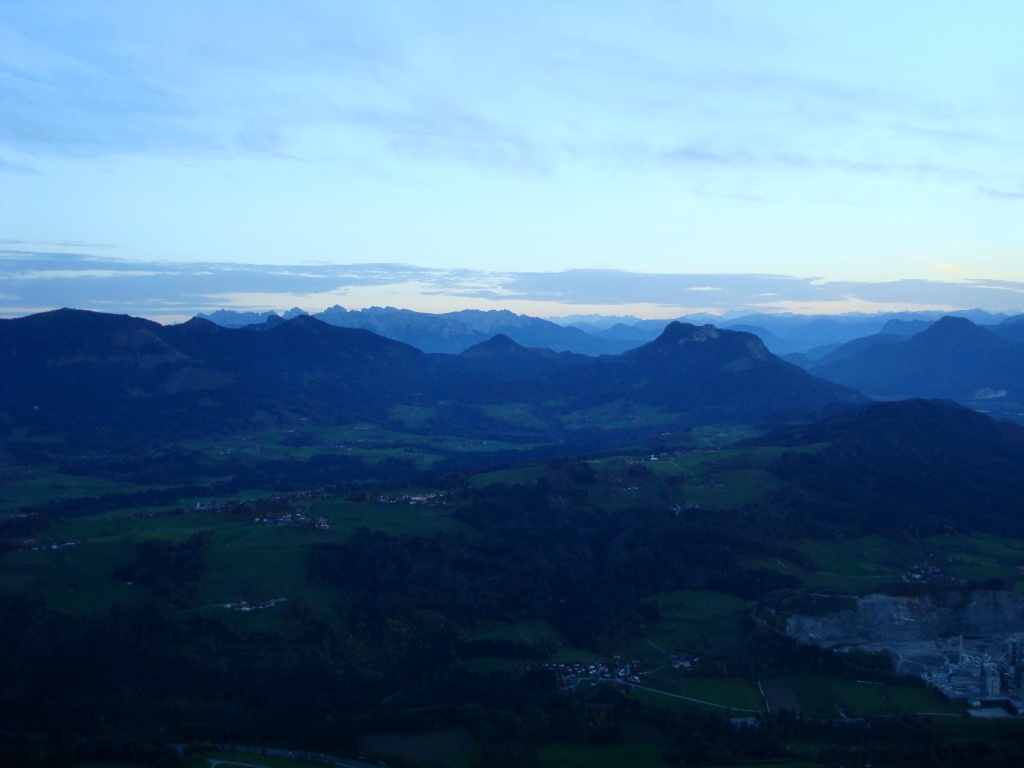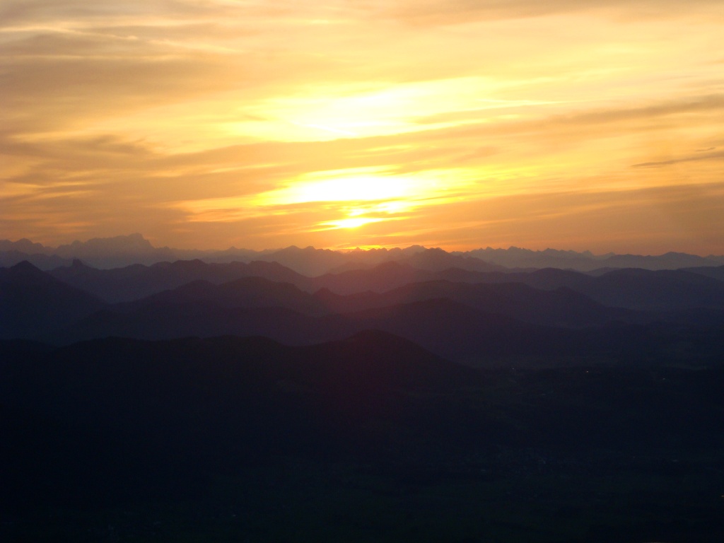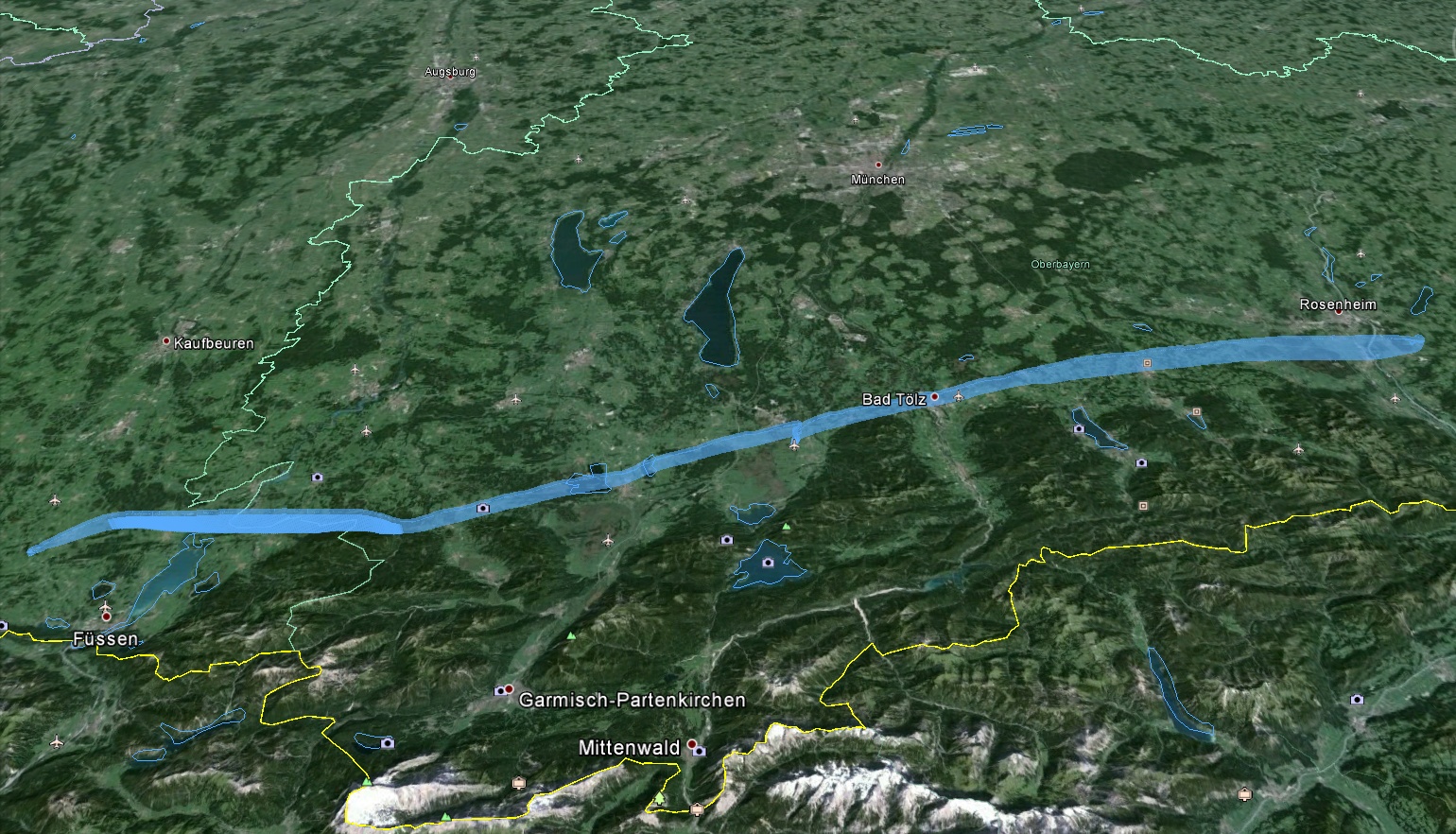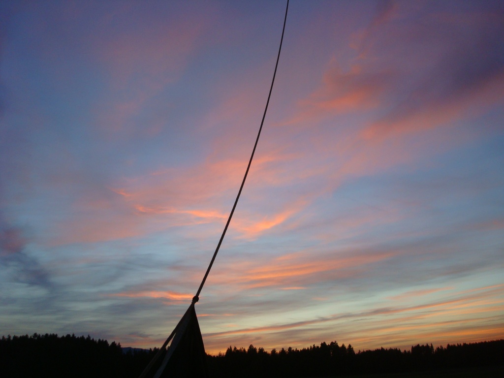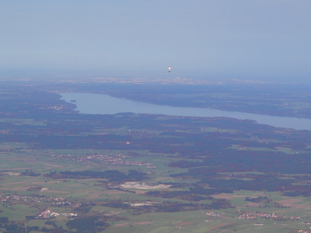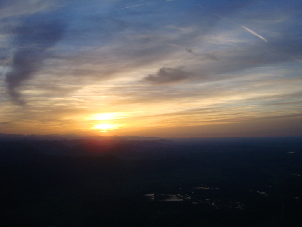 Within the next four hours, winds up to 30 knots took us along the northern edge of the Alps, over the towns of Murnau, Penzberg and Bad Tölz, past lake Tegernsee and the river Inn. Finally, we decended with the setting sun towards a large field near Lauterbach (Rosenheim), where we had a calm and perfect landing. Altogether, we covered a distance of 130 kilometers!