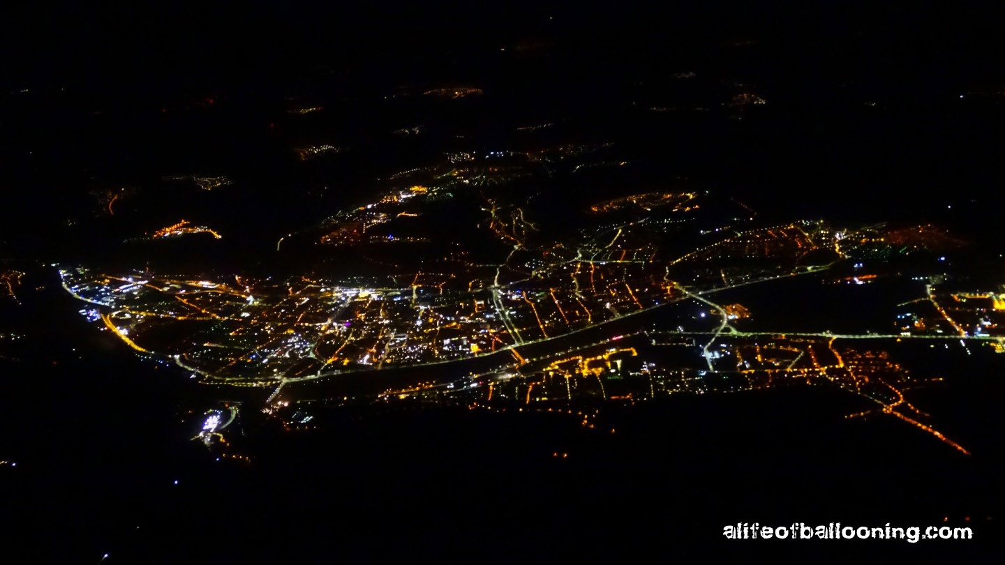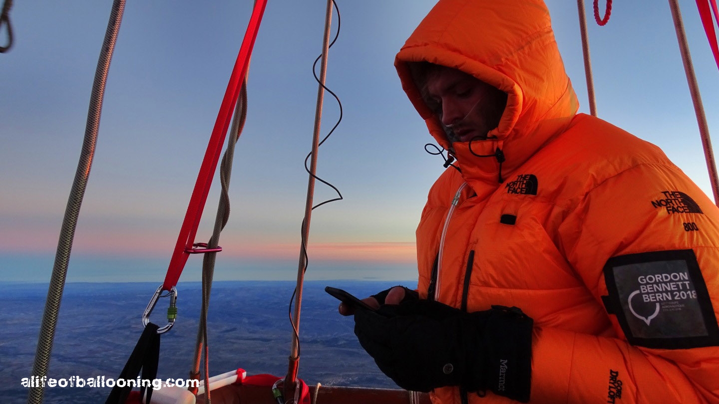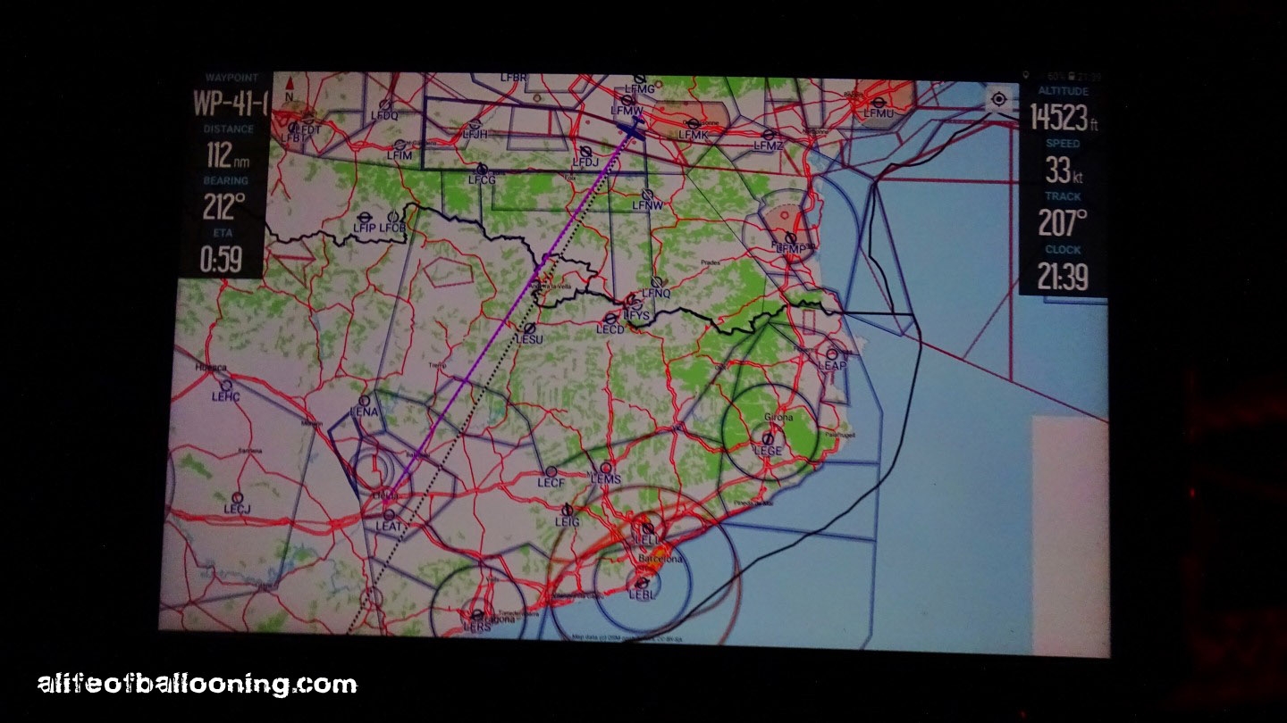 The day above France was not really spectacular – agreeable temperatures, perfect direction, wonderful views. Flying closer towards Toulouse, we decided that we were ready for the Pyrenees and the second night. As the sun set, we had done all preparations for the second night: Boiled some hot tea water that would keep us warm through the long cold night, oxygen system was up and running, our chase crew was informed, clearance for higher flight levels had been granted… the only thing to do was to lose some more ballast. Which was easier said than done, as the wet sand had started to freeze, and although we had mixed part of it with salt, it was still a strenuous job to get it out of the bags and crush it to dust.