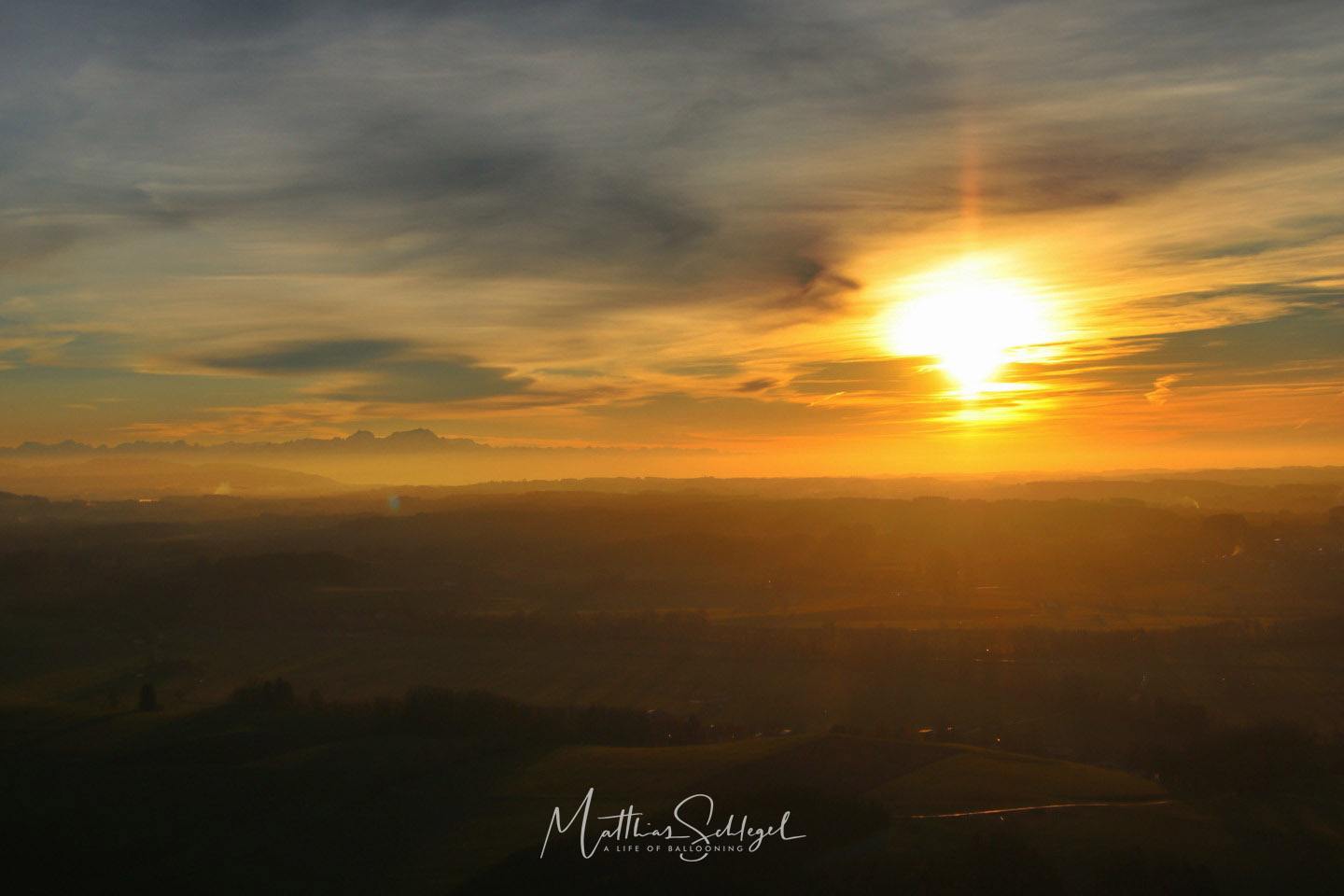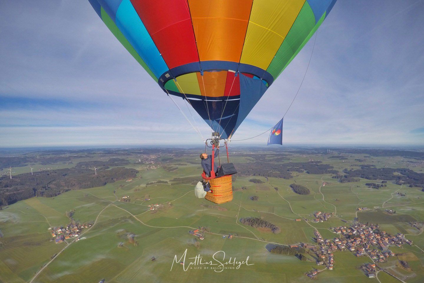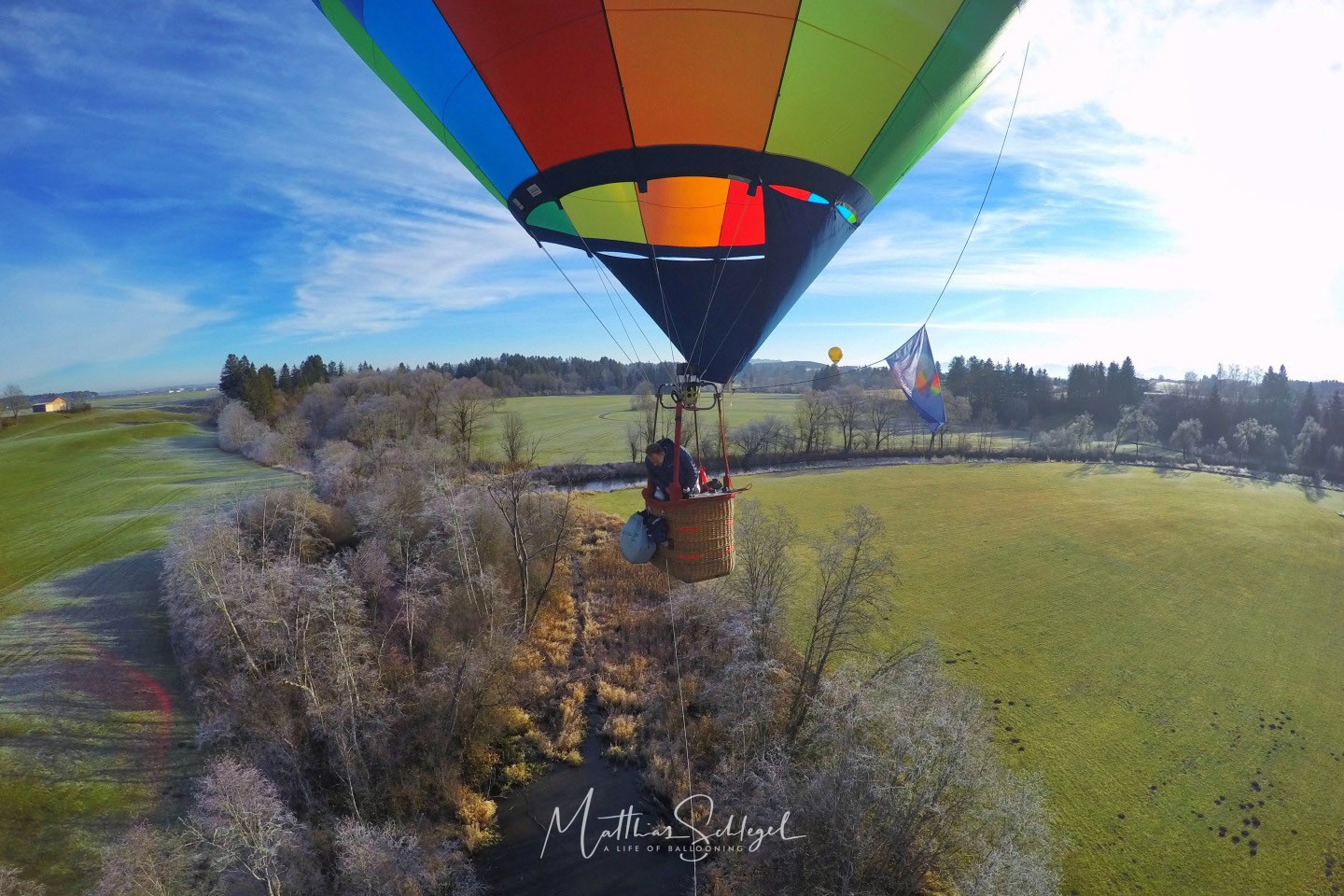 The first hour was quite chilly: About -5°C had been predicted, and my thermometer in the basket showed exactly that. But preparation is everything, warm clothes and hot tea kept me comfortable. The rising sun made a surprising difference in consumption: it dropped from 0.8 L/min to 0.3 L/min, flying in low altitude. This was not entirely unexpected, of course, as I myself had chosen dark blue as the main colour of the envelope! ;-)