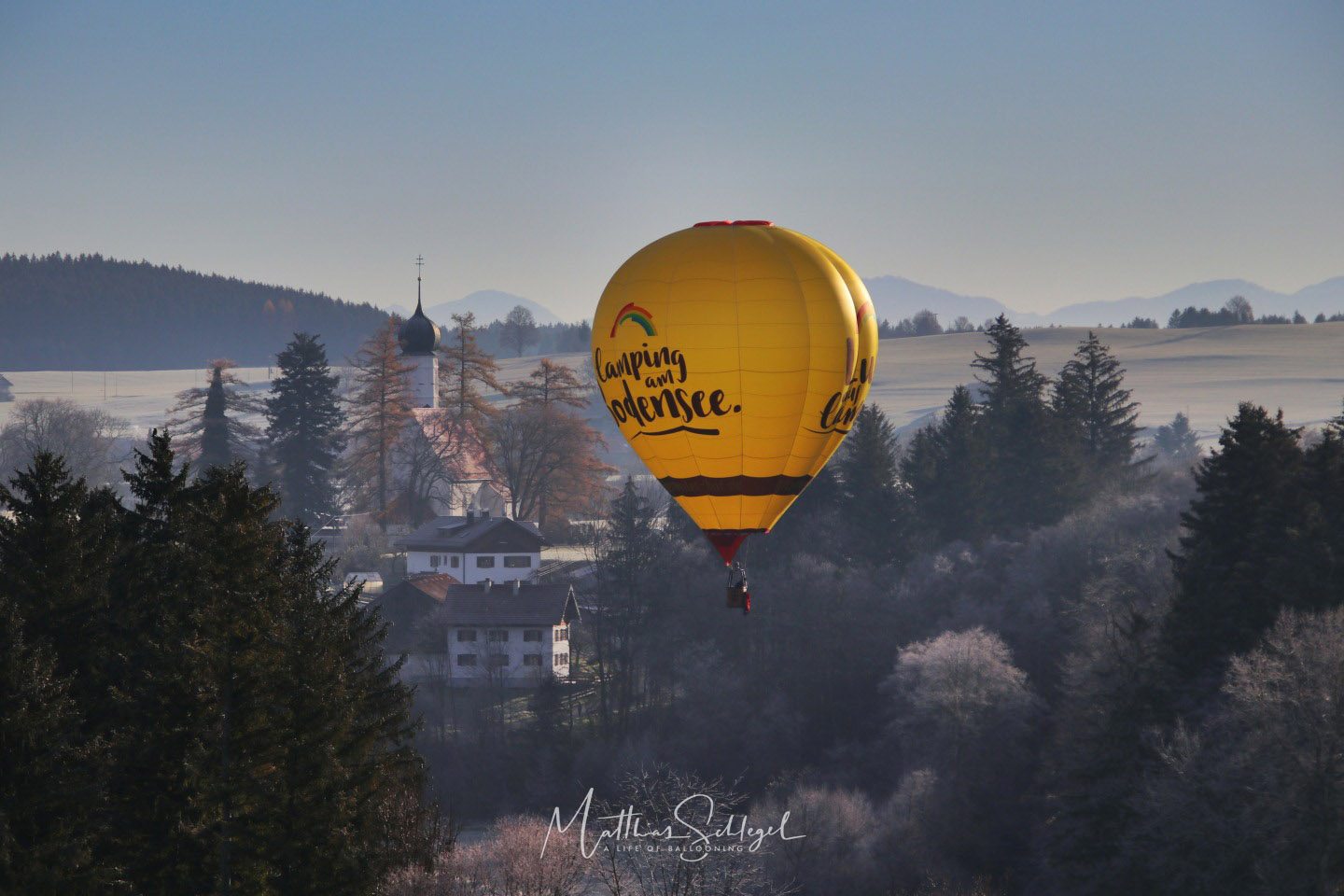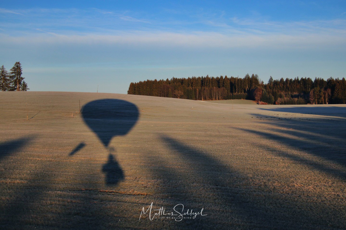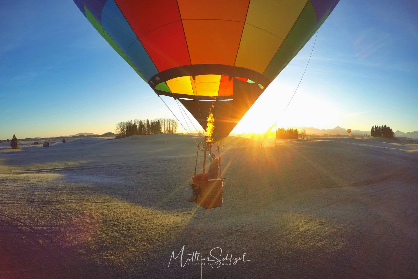 The first hour was quite chilly: About -5°C had been predicted, and my thermometer in the basket showed exactly that. But preparation is everything, warm clothes and hot tea kept me comfortable. The rising sun made a surprising difference in consumption: it dropped from 0.8 L/min to 0.3 L/min, flying in low altitude. This was not entirely unexpected, of course, as I myself had chosen dark blue as the main colour of the envelope! ;-)