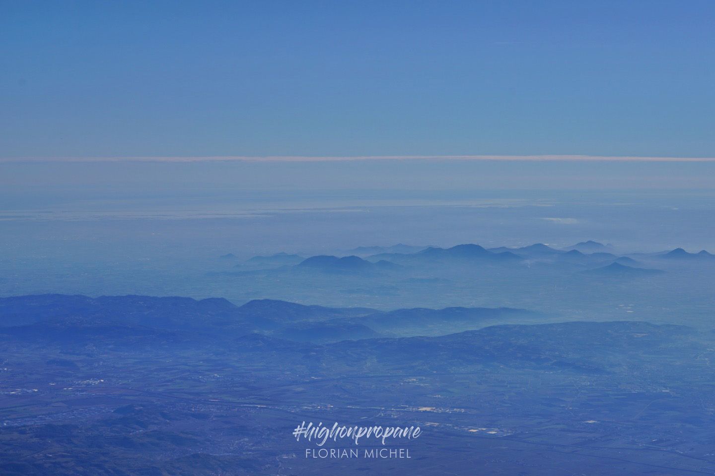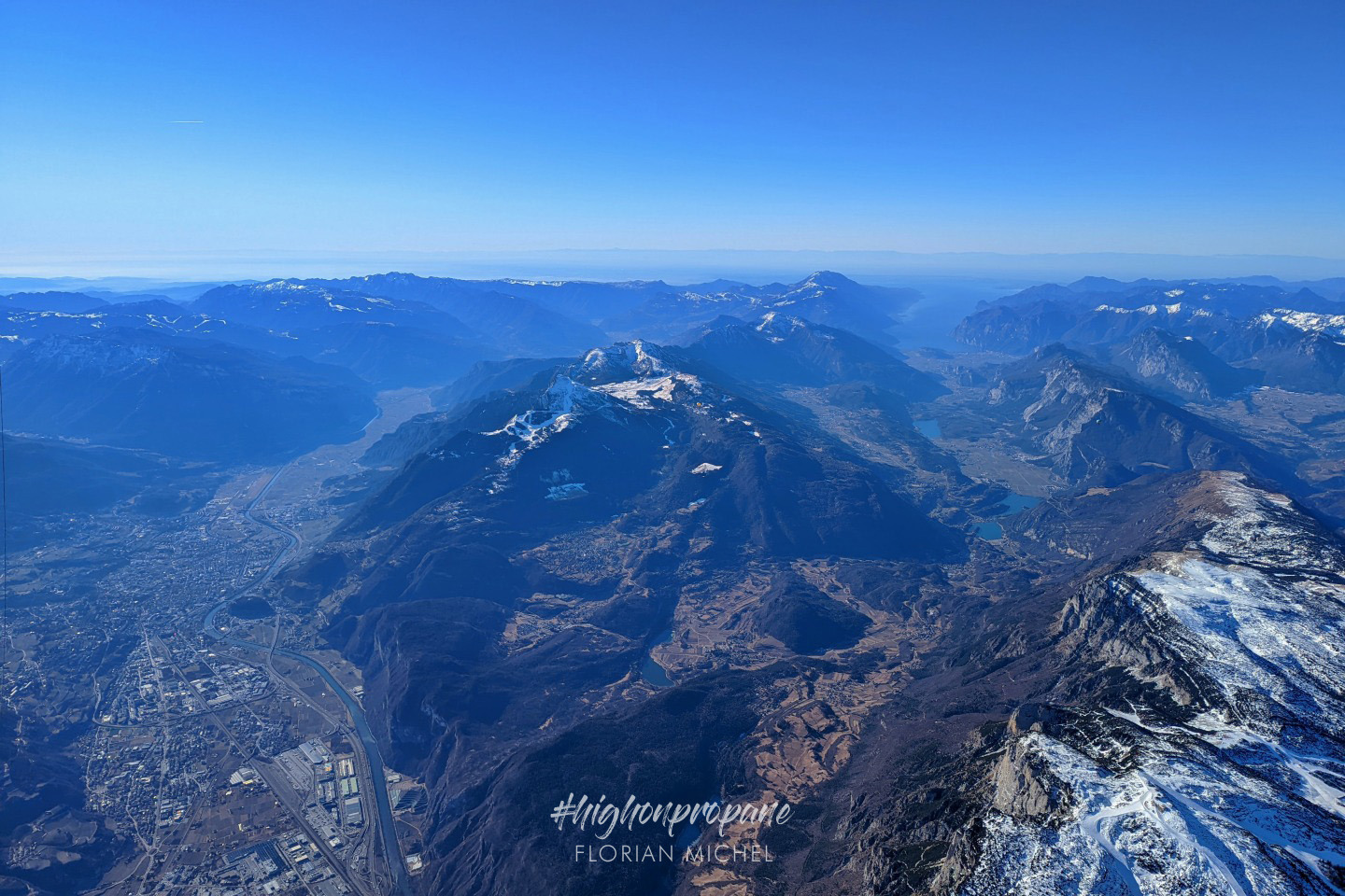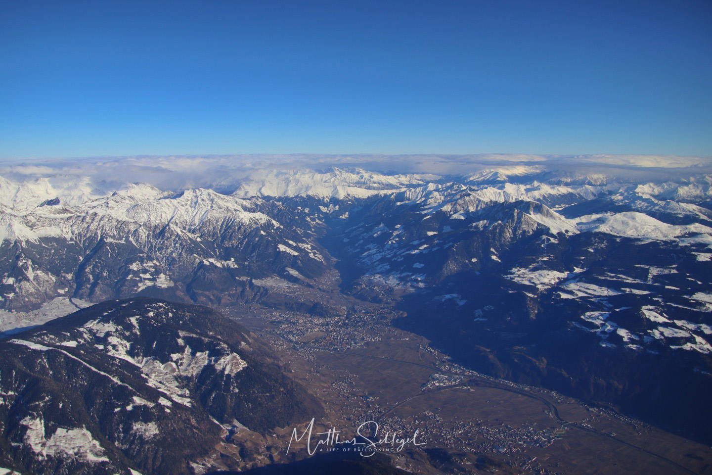 Flying further south, the clouds disappeared, and we could soon enjoy the entire beauty of the majestic mountains. And down the Merano valley, an orange lining appeared on the horizon: The Adriatic Sea!