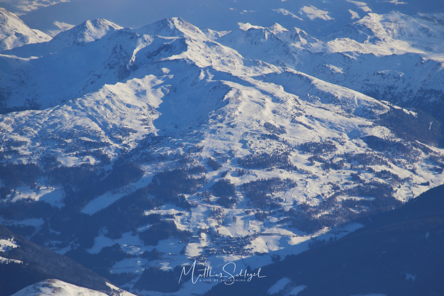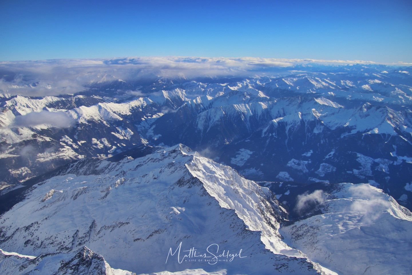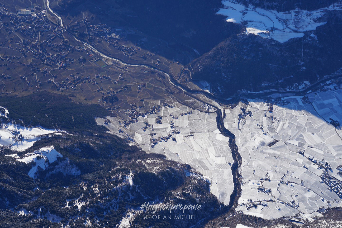 Flying further south, the clouds disappeared, and we could soon enjoy the entire beauty of the majestic mountains. And down the Merano valley, an orange lining appeared on the horizon: The Adriatic Sea!