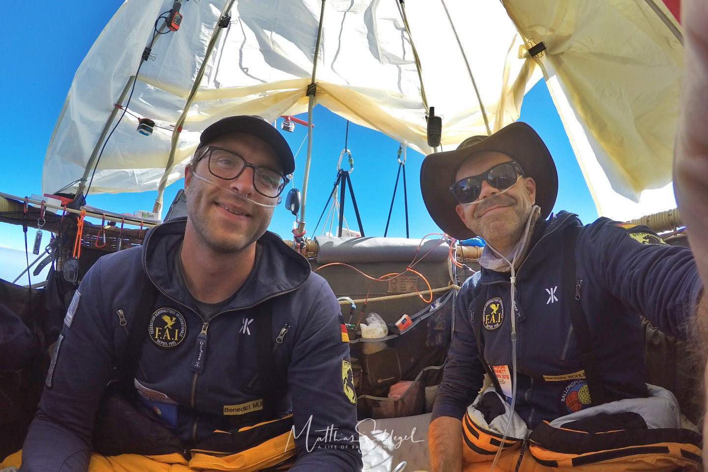 Things got really exciting for us on the morning of the second day: for the first time in the race, our balloon climbed to over 3000 meters time due to the rising sun and it was time to put on the oxygen masks. We has tested the mechanical fit of our adapter for the American bottles, but not its tightness – now the rushing before takeoff took its toll! An improvised rubber seal from the protective cap of one of the oxygen tanks, cut out with the scissors of a pocket knife, finally produced the desired result – the system was tight and we could breathe again. The balloon was allowed to rise further and our journey could continue.